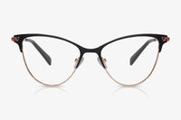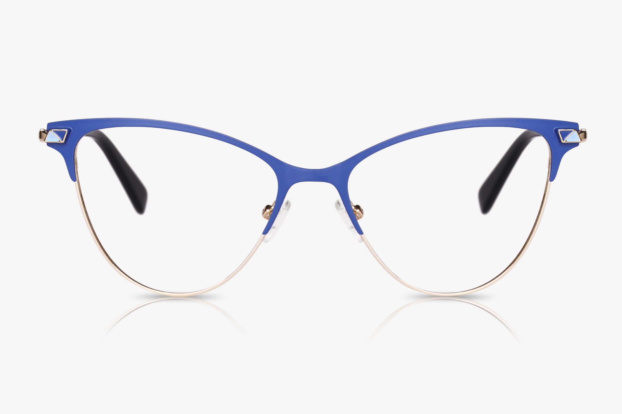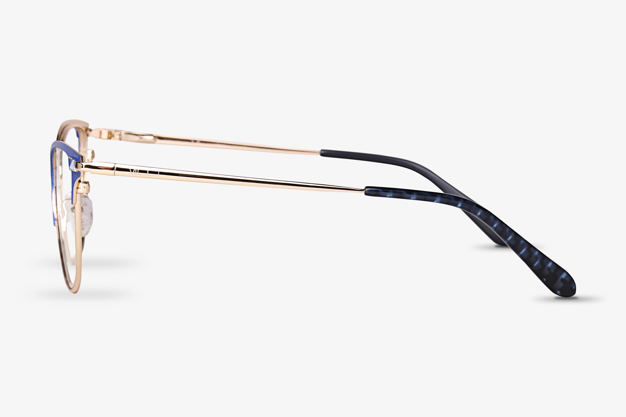 Curvy cat-eye glasses make a bold statement. Blue acetate strikes the perfect contrast with the gold wire frames. Pearlescent temple tips complete the look.